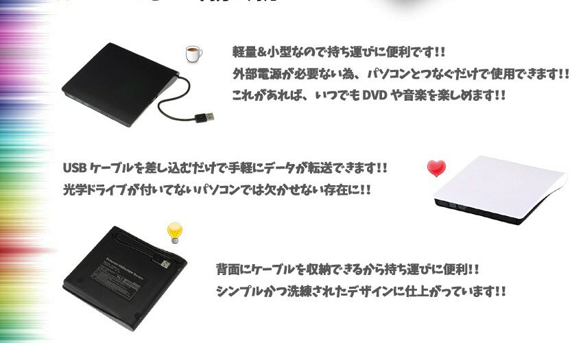 書き込み速度 CD-R : Max 24X CD-R : 24X DVD+R : 8X DVD-R : 8X DVD+RW : 8X DVD-RW : 6X DVD-RAM : 5X DVD+R9DL, Dual-player : 6X DVD-R9DL, Dual-layer : 6X 読み込み速度 CD-ROM : 24X DVD-ROM : 8X 寸法 : 16.5 x 16.5 x 2.5cm 重量 : 315g 電圧 : 3-5V インターフェイス:USB 3.0 コネクタ形状:USB(USB 3.0 Micro-B) ★