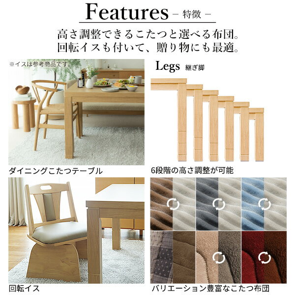 【セット構成】こたつ本体x1台/こたつ布団x1枚/回転椅子x4台 【布団バリエーション】しじら織り・レンガxブラウン・ベージュxグレー 【仕様】 ■こたつ本体 天板:繊維板(転写プリント) 脚部:天然木(ラバーウッド) 薄型石英管ヒーター(500W・中間スイッチ式) コード長さ:約3m ◎一部組立(脚部取付) ■こたつ布団 [しじら]表地:綿100% 裏地:アクリル100% 中綿:ポリエステル100% [レンガ・ベージュ]表地・裏地:ポリエステル100%(はっ水フランネル) 中綿:ポリエステル100% ■回転椅子 フレーム:天然木(アカシア) 座面:合成皮革 ◎一部組立(脚部取付) 【サイズ】 ■こたつ本体 幅150x奥行90x高さ45/50/55/60/65/70cm(継ぎ脚10cmx2個 5cmx1個)・約28kg ■こたつ布団 [しじら]310x250cm・中綿約1.55kg [レンガ・ベージュ]312x252cm・中綿約780g ■回転椅子 幅46.5x奥行49x高さ75(70)cm・約9kg 株式会社ナカムラ(I-3300259)